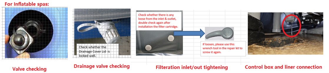 - Si de l'eau continue d'apparaître, la fuite peut provenir de la doublure du spa elle-même ou près des connexions de la doublure.